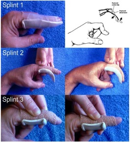 Splint 3 - This splint allows the end joint of the finger to bend but not the injured joint.  The exercises stop the end joint getting stiff and should be repeated 6 times after splint 2 exercises.