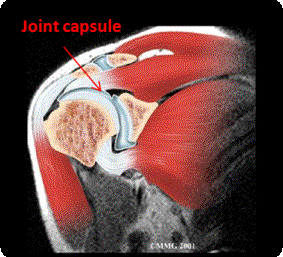 Frozen shoulder is also called capsulitis, and is thickening of the lining of the joint (capsule). The lining of the ball and socket joint is usually thin and stretchy like a rubber balloon. This allows the shoulder joint an enormous range of motion. However due to an inflammatory process this lining thickens and becomes stiff like a rubber wellington boot, resulting in a decreased range of movement. The inflammation of the joint capsule occurs in the early stages of the condition and is very painful. In the end the pain subsides and the thickened capsule consolidates with scar tissue and the loss of movement is the main feature.