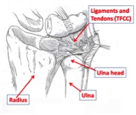 the hand is attached to the radius and it rotates around the ulna at the distal radio-ulna joint.Arthritis occurs when the cartilage which lines the joints is worn away and is found in any joint of the body. The joint in the wrist which allows you to rotate the forearm is called the distal radio-ulna joint or DRUJ and can be subject to arthritis. Symptoms are increasing pain, stiffness and mild swelling. It is usually due to instability or an injury from years before.