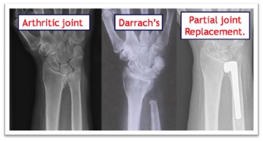 t a joint replacement gives better results than removing the ulna head.  This is because a Darrachs procedure in these patients can result in pain when gripping and carrying things as the stump of the remaining ulna bangs into the radius bone.  Only half of the ulna head is involved in the joint itself, the other half has ligaments an